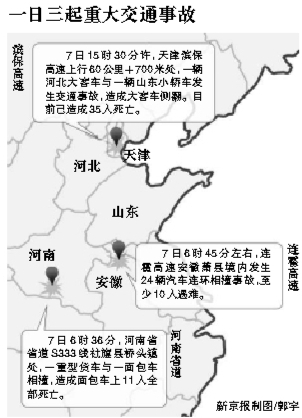 据宿州市公安局交警支队支队长许云淮介绍,由于浓雾天气,导致今晨该路段能见度严重偏低。在发生的7起连环追尾中,其中1起造成4人当场死亡,另有1起造成1人当场死亡,还有一名重伤者由于被卡在车体内,在消防人员实施切割救援时死亡。