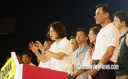 民进党台一线活动首场大型晚会造势8日在高雄市劳工公园举行,参选人蔡英文(中)发表“国政演讲会”。“中央社”图