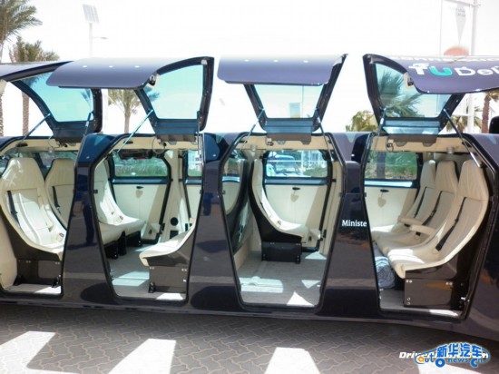 它采用磷酸铁锂电池,借助太阳能充电。它的内饰堪比豪华轿车或私人飞机。车身两侧各有8扇门,方便乘客上下车。