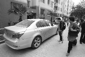 前日下午4时许,记者赶至该小区,微博上显示的宝马5系轿车还在原地停着,车上贴的纸条还在。宝马车的右前门把手附近有一处凹陷的痕迹。