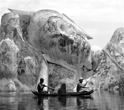 10日,在受灾最严重的大城府,当地农民划船经过一座古代卧佛。目前,大城府内许多文物古迹都浸泡在洪水中。