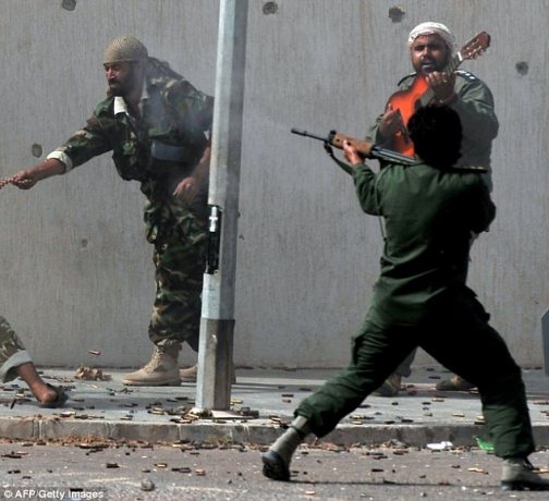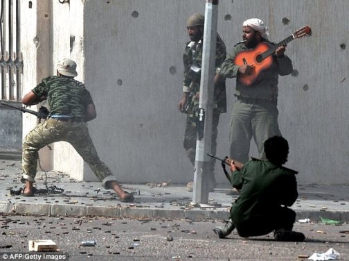 在卡扎菲家乡苏尔特,利比亚当局武装士兵正与效忠卡扎菲的部队激烈交火,战场上一名男子淡定弹奏吉他引人注目