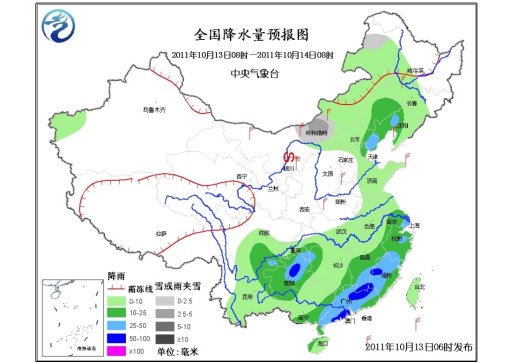 13日08时至14日08时,内蒙古中东部有小到中雨(雪)或雨夹雪;内蒙古东南部、华北东北部、辽宁中西部、江南中东部、华南大部、西南地区东部等地的部分地区有中到大雨(10~35毫米),其中,贵州中部、福建西部、江西南部、广东东北部和西南部的部分地区有暴雨(50~70毫米)。西北地区东部、内蒙古、东北中西部、华北、黄淮等地有4~6级风。受“榕树”的影响,南海中南部偏东海域风力有6~7级风,风暴中心经过的附近海面风力可达8~9级。