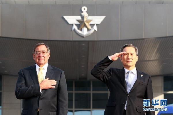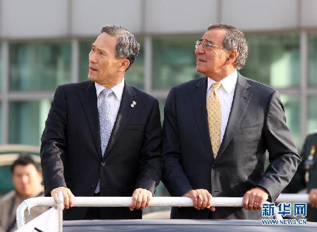10月27日,在韩国首尔,韩国国防部长官金宽镇(左)为到访的美国新任国防部长帕内塔(右)举行欢迎仪式。 新华社发(朴真熙摄)