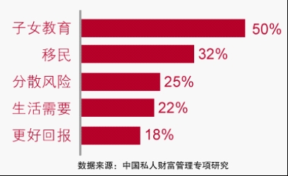 子女教育是海外投资的最主要目的,一半的高净值人群因为子女教育而进行海外投资,另外32%海外投资是为了移民。
