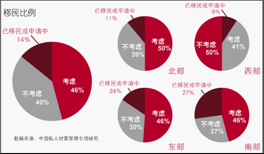 六成高净值人群有移民意向或已申请移民,其中东部和南部有移民意向的超过7成。目前已移民或者在申请中的比例为14%,东部和南部为25%左右。
