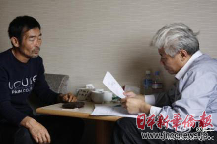 《日本新华侨报》总编辑蒋丰(右)在听死者朱永冲父亲的讲述。