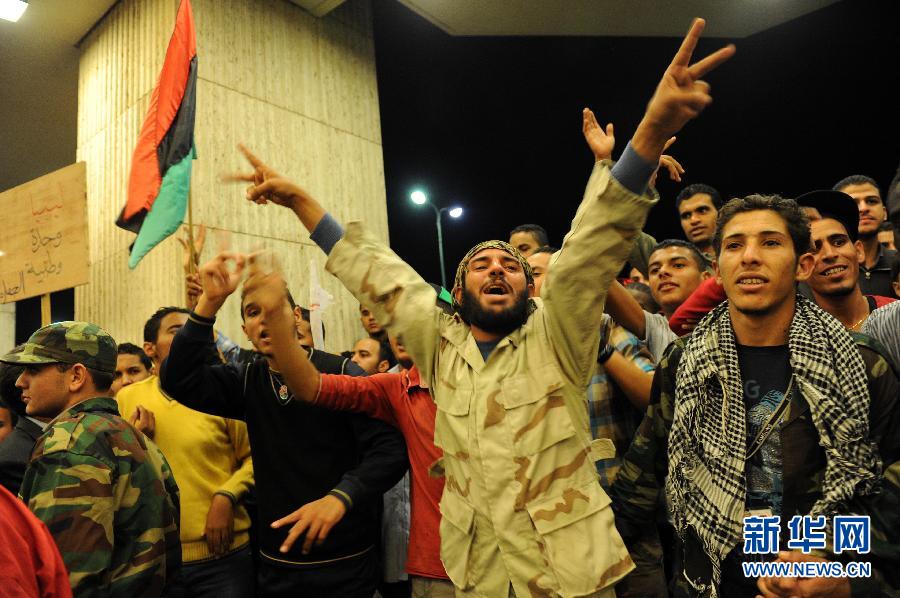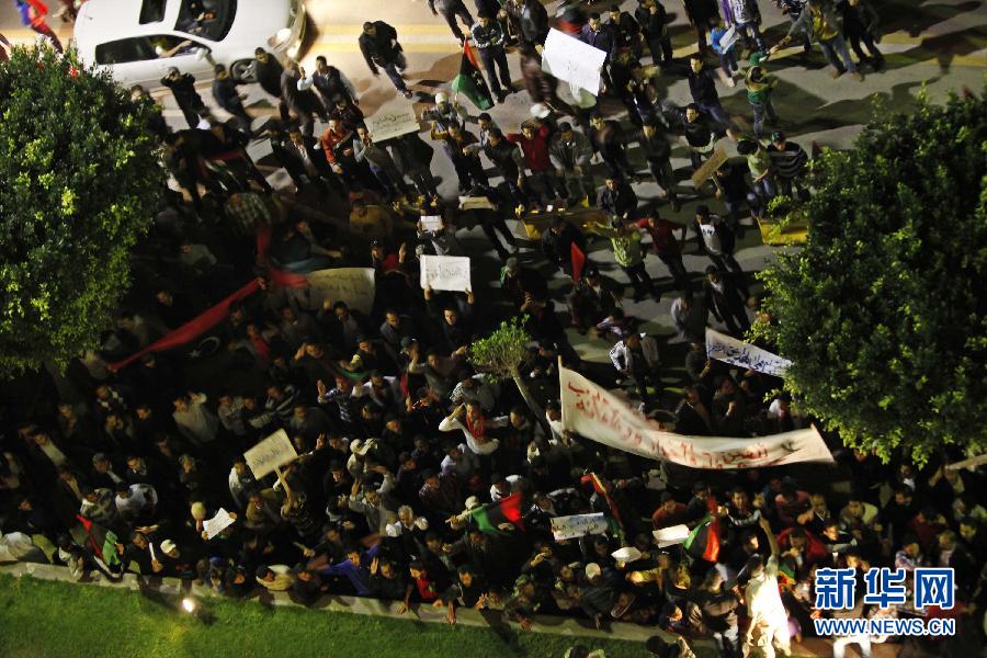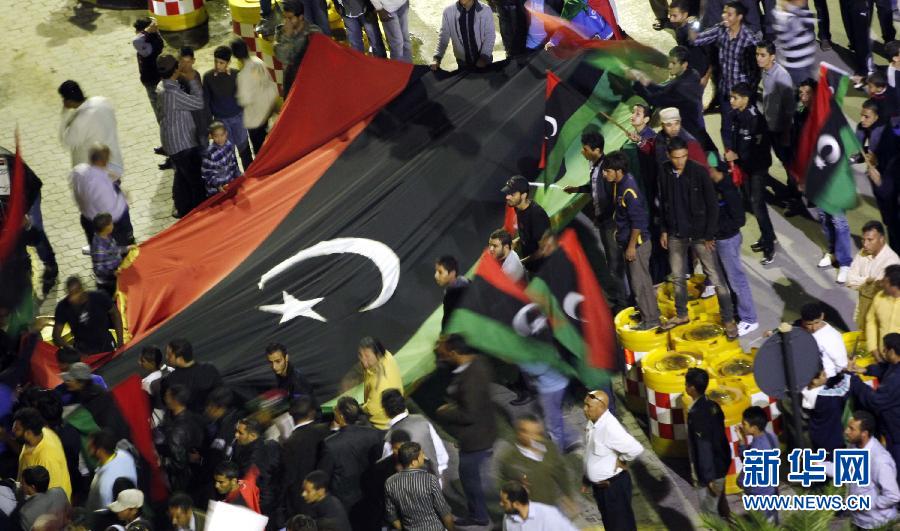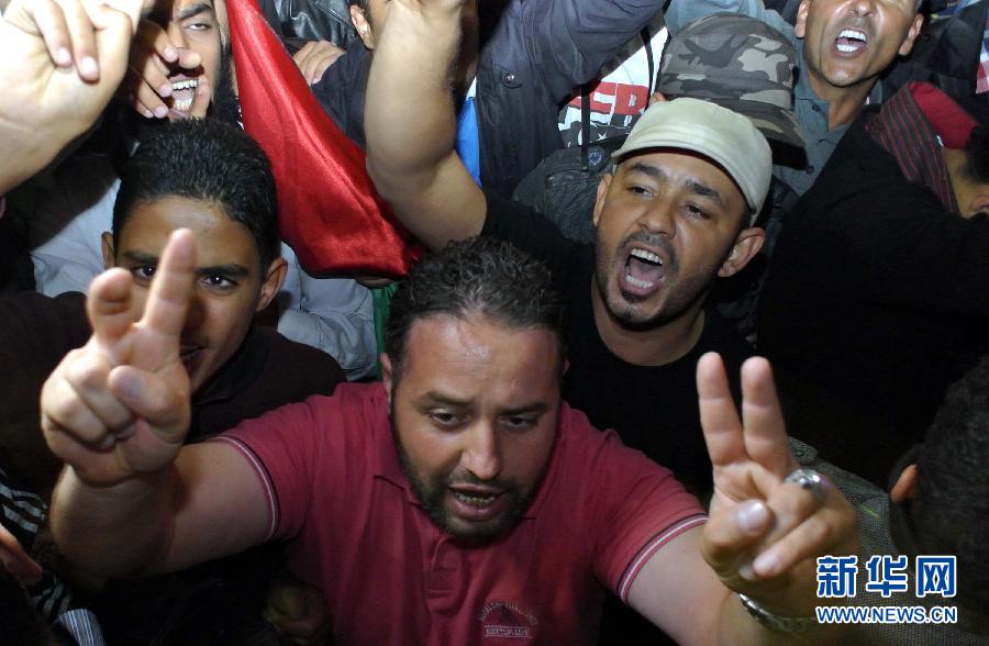 11月14日,在利比亚首都的黎波里,利比亚青年参加游行示威。的黎波里当日爆发大规模游行,为日前发生在扎维耶附近的武装冲突中死去的数名沃法纳人鸣冤,并号召自由利比亚电视台及扎维耶地方武装向沃法纳人致歉。据示威者称,此前该电视台称卡扎菲的儿子赛义夫与其支持者藏身沃法纳,导致扎维耶地方武装前去战斗,并与沃法纳武装力量发生冲突,扎维耶方动用了杰拉德导弹等重型武器,冲突造成多名平民死亡。