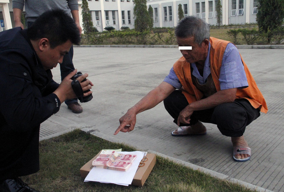 1月14日,在广西贵港市看守所,犯罪嫌疑人洪某正在指认其贩卖的假币。