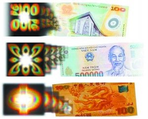 此外,澳大利亚研究人员在塑料钞票上采用了OVD光变图像技术,能在不同照明度和视角产生不同的色彩和图样。罗马尼亚在塑料钞票上应用了同色异谱油墨印刷技术;此外,越南、泰国、巴西等国还采用了浮雕压印技术,即在塑料基片的透明视窗处采取无墨压印浮雕图案。
