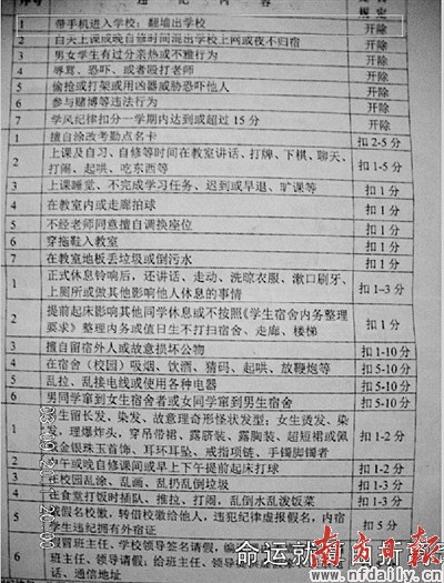 另外,还有包括学生头发在内的19种情形将被扣除1—10之间的不等分数,而一学期如果扣分达到或超过15分也要被开除。