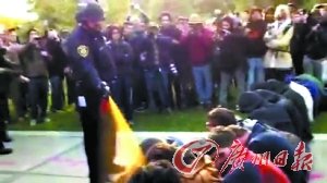 本报讯 美国警方近日向各地“占领华尔街”运动施压,警方上周五在戴维斯的加州大学校园与示威者对峙,其后突然近距离施放胡椒喷雾,强行将他们带走。片段上载至视频网站后引起强烈反响,目前,涉事的警员已被勒令停职。