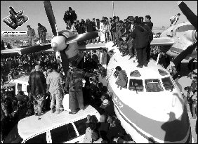 运送赛义夫的飞机降落后,当地民众和武装分子爬上飞机。图/人民图片