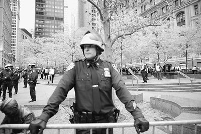 11月21日,记者在纽约曼哈顿华尔街采访时发现,自上周纽约警方强制清理位于曼哈顿祖科蒂公园“占领华尔街”运动的大本营后,坚持了两个月之久的抗议运动发生明显变化。如今,大本营曾经火热的场面已荡然无存,公园四周被金属隔离带严严实实地围了起来,仅留两三个出口。隔离带外围站了一圈全副武装的执勤警察,隔离带内还有数十名号称“公园保安”的武装警察,公园不远处停放着数辆警车。看上去,警察似乎比抗议的人还多。