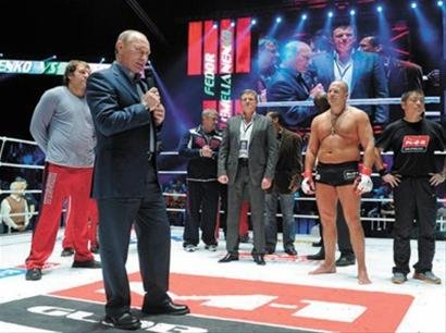 在当天的比赛中,俄罗斯著名重量级格斗选手菲多·艾米连科战胜美国选手杰夫·蒙森,普京走上擂台向前者道贺。他刚说了一句“今天所有格斗迷们享受了一场盛宴”,现场近2.2万名观众就发出嘘声。这一幕遭到电视直播。他停了一会儿,提高音量继续讲,“我们都很感激艾米连科,他是一个真正的俄罗斯猛士。他很强,不仅是因为他的肌肉,还有他的品格。你是一个真正的俄罗斯猛士,我向你致敬,菲多。”