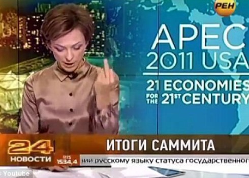 俄罗斯女播音员莉马诺娃在读到“奥巴马”的时候比出中指。
