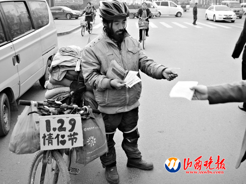 今日(27日)下午,一位风尘仆仆、头戴自行车头盔的男子来到本报办公室,将一份写有“情感环保———1·29情侣节”的宣传单递给记者,说自己叫刘成义,黑龙江鸡西市人,今年32岁,单身,原本是一名普通打工者。“不管在电视剧还是现实中,总能看到因为感情不和而分分合合的事情,我觉得这不论是对自己、爱人还是对儿女都是不好的,所以我想到自创一个情侣节,倡议大家让感情环保,更加珍惜身边的感情。”刘成义说,去年6月17日他骑上420元买的一辆永久自行车,从家乡出发,开始了他的骑行生涯。现在,他已经骑行了吉林、辽宁、河北、北京、天津、西藏等29个省市自治区,于昨天下午到达到太原。
