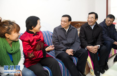 图:李克强来到金泰小区低保户李恒燕家住的廉租房,了解她入住前后的生活变化。