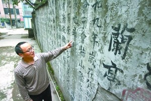 记者看到,这堵书法墙总长约40米,墙高约2米,白底黑字,竖向结构,用毛笔手书,看上去端庄秀丽,遒劲有力。由于书写时间较长,墙面已多处破损,墙漆脱落也比较严重。