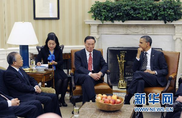 5月9日,美国总统奥巴马在华盛顿白宫会见正在当地出席第三轮中美战略与经济对话的中国国家主席胡锦涛特别代表国务院副总理王岐山、国务委员戴秉国。新华社记者张军摄