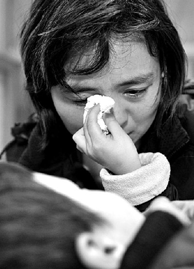 昨天,一名接受检查的儿童躺着为妈妈擦拭眼泪。新华社发
