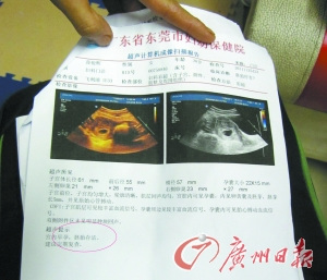 在11月25日,东莞市妇幼保健院出具的“超声计算机成像扫描报告”中,记者看到,“超声提示,宫内早孕,胚胎存活,建议定期复查”。