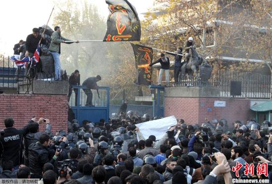 11月29日,伊朗数百名学生在位于德黑兰市中心的英国驻伊大使馆附近示威,其中几十人闯进大使馆内部。示威者投掷石头及汽油弹、拿下并焚烧英国国旗及馆内文件,又挥舞拿走的英女王画像。6名大使馆职员一度被挟持,但在伊朗警方协助下获释。