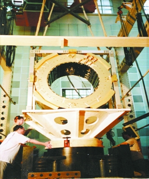 “鲜为人知的是,它体内有一颗强大的‘中国心’——一块‘MADE IN CHINA’、内径约1.2米、重约2.6吨、中心磁场强度1370高斯的环形巨大永磁铁(左图)。”中科院高能物理研究所所长、中科院院士陈和生接受新华社记者专访时说。