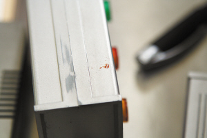 岗亭内不锈钢桌边沿仍留有血迹