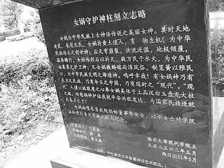 雕塑下方的碑文是关于“雅典娜”的介绍,同时附带了校方的说明:“雅典娜面相采自我院创始董事郭女士,以示郭女士对学院征地建设重大贡献之永久纪念。”不远处的“女娲”雕塑的面相采自创始董事李女士。两座雕塑的创意撰文人同为刘家全,他是西北大学现代学院院长。