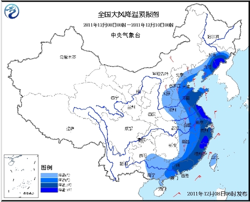 受较强冷空气影响,预计12月8日08时至12月10日08时,东北地区南部、华北中南部、黄淮、江淮、江南中东部、华南等地将先后出现4~6级偏北风并伴有6~8℃降温,其中东北地区东南部、黄淮东部、江淮东部、江南东部、华南东部等地的部分地区降温10℃,局地降温可达12℃。我国东部和南部海区自北向南将先后出现7~9级、阵风10级的偏北风。9~10日,江南、贵州等地的部分地区将出现初霜冻。