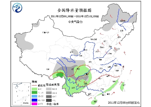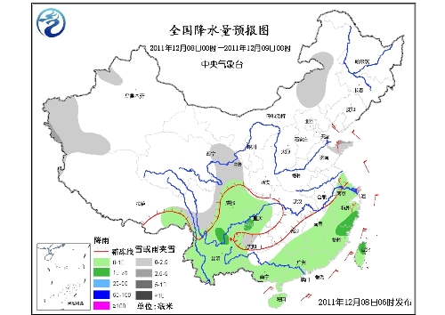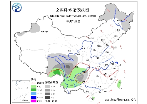 8~10日,新疆西南部有降雪或雨夹雪;8日,江南东部和南部、华南北部有小雨。8~11日,青藏高原东南部、西南地区东部持续阴雨天气。