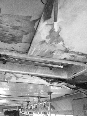 一辆开往龙袍的621路公交车内湿漉漉的,后排天窗处有好几道裂口,雨水顺着裂口滴在座椅上,车内侧板已被雨水泡得脱落鼓包,手一撕就能扯下,地板上还有个大洞。司机告诉记者,这车漏水已经很久了,是有司机穿雨衣开过车。