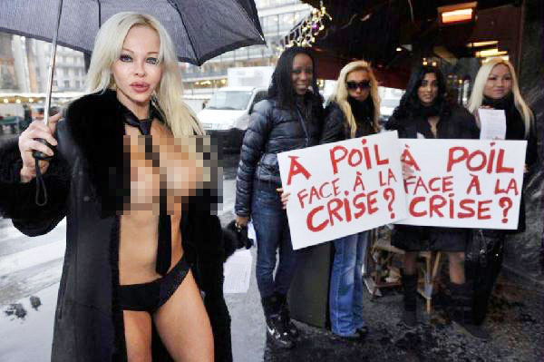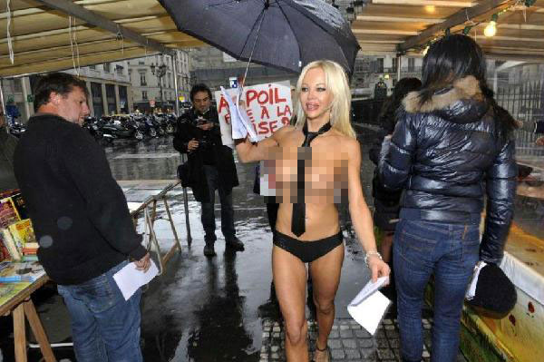 当地时间2011年12月6日,法国巴黎,2012法国总统候选人Cindy Lee裸体在街道上拉票,为竞选造势。