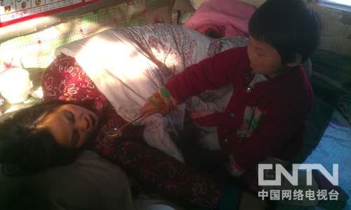 小女孩名叫孙悦,因天天只吃些面糊、米粥和咸菜,显得有些营养不良。穿得更是破破烂烂,裤子双腿已经从中间撕开了,露出了棉裤。脚下是妈妈穿过的塑料拖鞋。这是记者6日在八家子屯看见她时的印象。当时她正在炕上喂妈妈水,舀水的小手略显粗糙,端得也有些不稳,但一下一下很是认真。妈妈边喝边流泪。披着棉袄依在炕头另一侧的爸爸孙跃民看到这一切,也是一脸的凄苦和无奈。见记者是生人,喂完水的小孙悦马上躲进了妈妈的怀里,不时往外瞄几眼。