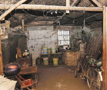 棚子低矮黑暗,进门要低着头,还要注意,不要碰到悬挂在那里的衣服,电线,或者还有一大块屋顶上破裂耷拉下来的塑料布。
