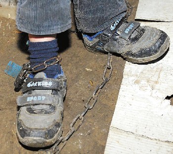 孩子不说话,走路时哐哐作响,右脚脚踝上,栓着一根长长的铁链。