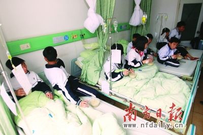 昨日上午11时许,记者在三水白坭华立医院二楼的病房内看到,不少穿着校服的学生正在病房内打点滴,由于人数较多,两三个学生挤在一张病床上。该校初一学生黄坚勇说,他是吃了前晚的晚餐后开始感觉不舒服的,“食堂的菜里有烧鹅,感觉有点臭,后来晚上10时多就开始拉肚子,一直拉到凌晨5时左右。”黄坚勇先是去校医那里检查,后来被转到医院。初二女生胡雪梅也觉得是烧鹅的问题,她从昨日的凌晨开始腹痛、拉肚子,早上7点多,被送去医院。