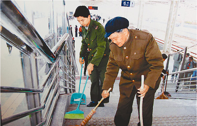 90多岁的刘应启在扬州火车站做志愿者。