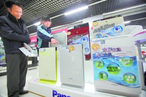 近日,(市场上的空气净化器、竹炭防尘口罩等出现热销。图为一家电器卖场的导购员在介绍空气净化器。