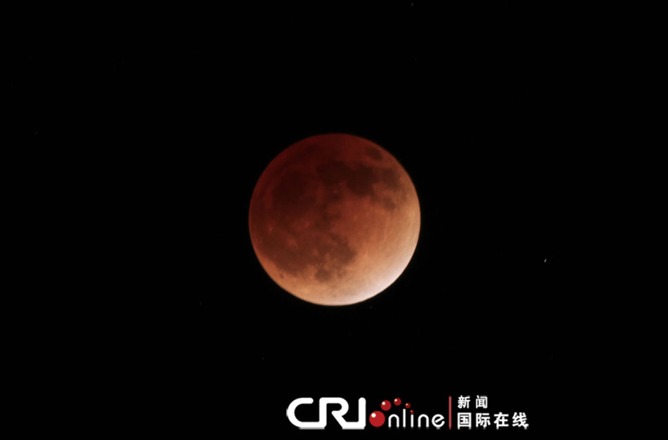国际在线消息:2011年12月10日晚,浩渺夜空迎来10年来我国观测条件最好的月全食。图为10日22点44分,北京上空的红月亮。摄影:国际在线记者沈湜