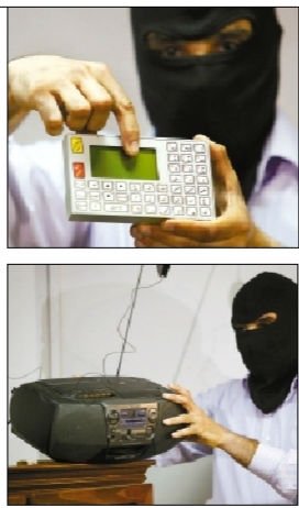 头戴面罩的情报人员在展示一台密码破译仪器(上)和一台可以接收密码讯息的录音机(下)。