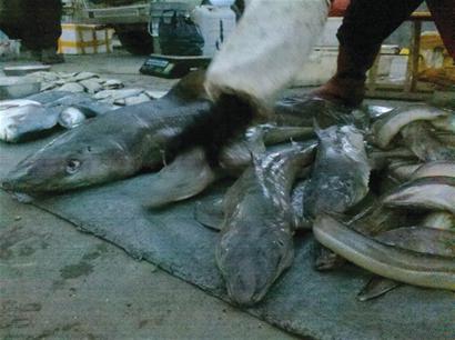 “市场上有人卖鲨鱼,摊主吆喝着说鲨鱼肉能治病,那些鲨鱼都挺小的,看着怪可怜的。 ”昨日,市民刘先生拨打晚报热线82860085称,自己在崂山区政府附近的早市上发现有人售卖长约1米多的小鲨鱼。不少市民都感觉比较新鲜,还有好几个人掏钱买回家“尝尝鲜”。 “一斤鲨鱼肉才十来块钱,和猪肉价格差不多,虽说以前就知道有人卖鲨鱼,但我觉得还是不妥,现在不是很多公益广告都倡导拒绝吃鱼翅保护鲨鱼么?再说,这些鲨鱼个头也太小了,恐怕是些鱼子鱼孙啊。 ”昨晨5时许,记者来到崂山区政府附近的早市,一进水产品区,就看到了一个卖鲨鱼的小摊。地上一字摆放了5条新鲜的小鲨鱼,最长的有1.5米左右,其他4条长约80厘米。虽然小鲨鱼已经死了,但是它们瞪着眼睛凶狠的样子,依然吸引了不少市民。不过,任凭摊主如何“讲解”,围观的人还是驻足观看的多,掏腰包购买的少。 “鲨鱼肉炖汤喝特别有营养,知道那个鱼肝油吧?就是从鲨鱼里提炼出来的! ”摊主告诉记者,这些鲨鱼都是远洋捕捞船打回来的,价格是一斤8元。