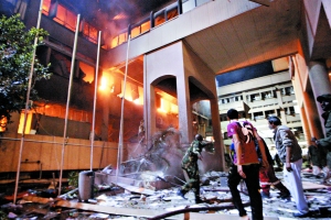 17日,的黎波里,一处政府建筑被北约战机空袭,燃起大火。