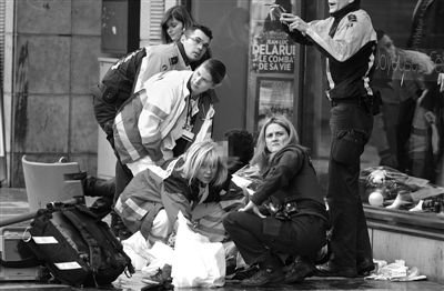 12月13日,比利时列日市圣朗贝尔广场发生枪击爆炸案,图为医护人员现场救治伤员。