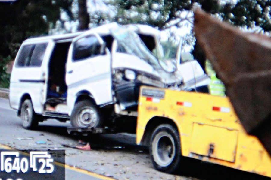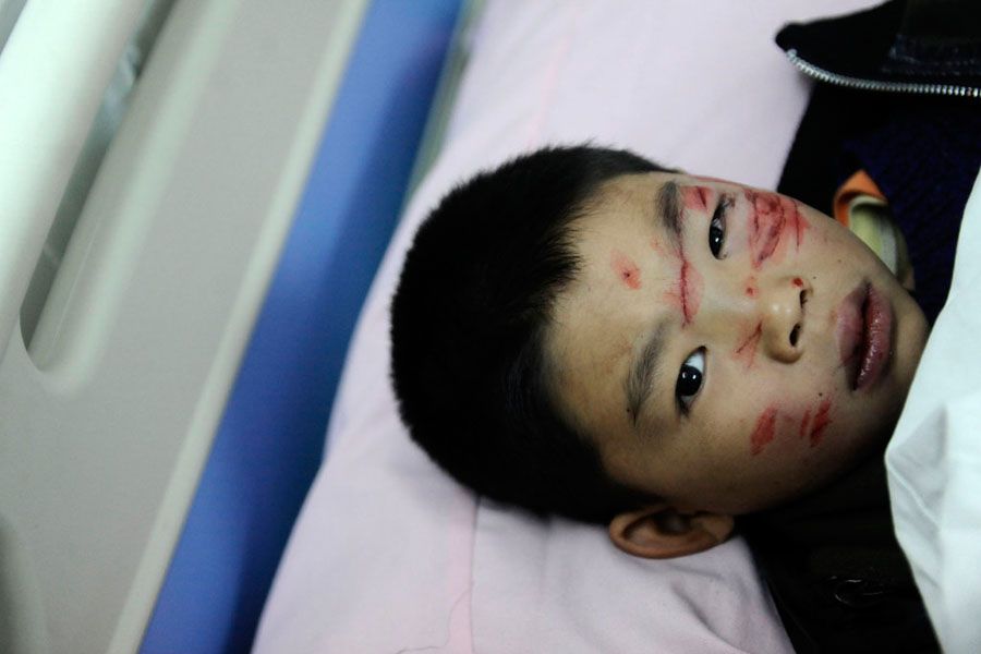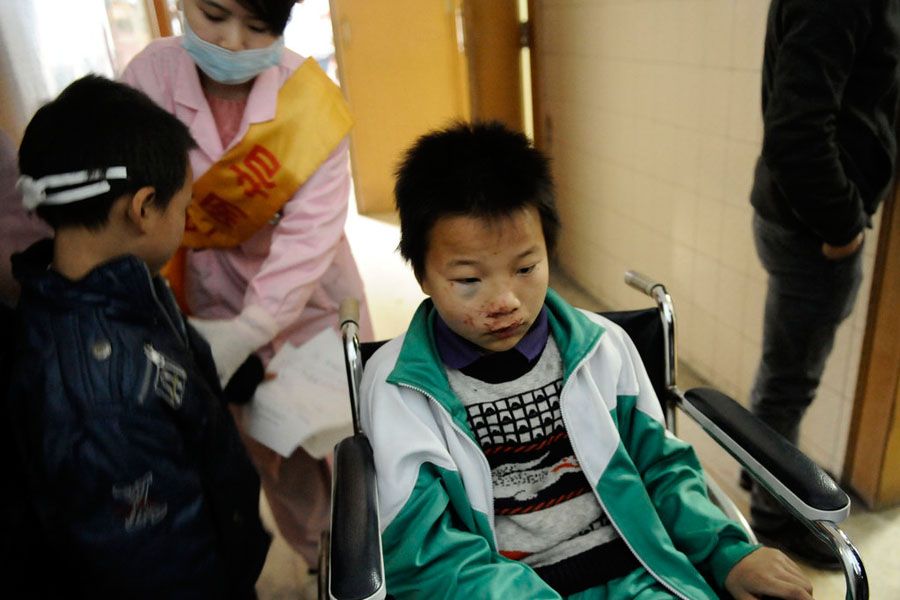 12月15日早7时许,广州市白云区博海小学一辆校车在行驶至白云区旧广花路阁塘路口时,撞到路边的大树。据初步了解,事故造成16名小学生、1 名老师、1名司机受伤,严重的当场昏迷,有人骨折,但无人死亡。图为发生事故的“临时校车”正被拖走,车头严重损毁。