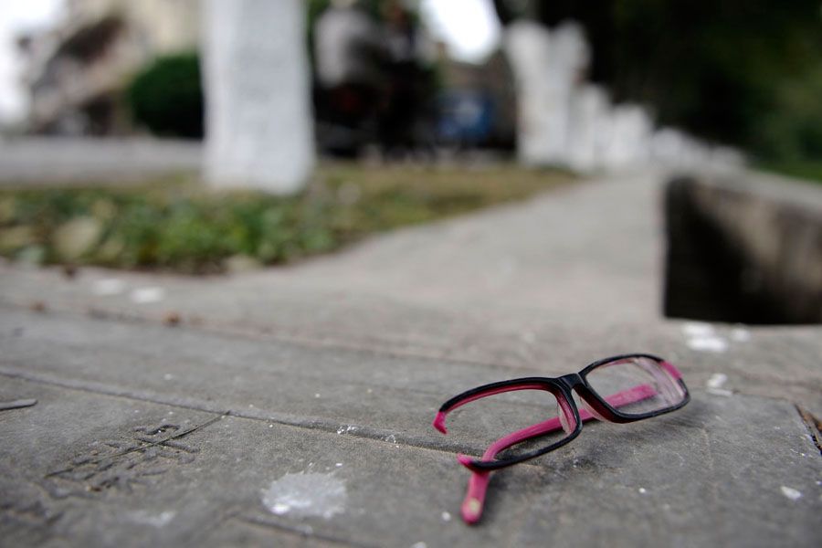 广州二汽公司511线公交车经过,司机黎锦聪见状停车,与乘客行人一块将受伤的学生抬上公交车,送往神山医院。据了解,校车为金杯面包车。白云区教育局称,该车为学校工作用车,属于违规接载学生。车上当时有18 人,额定载客数为12人,超载6人。事故原因正在调查中。图为事故现场留下的学生眼镜。