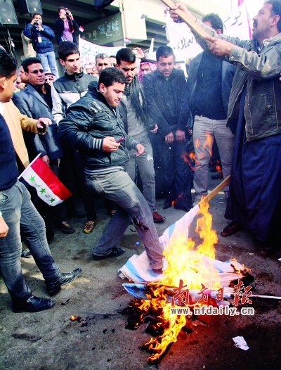 14日,伊拉克民众在费卢杰举行集会,大喊反美口号,并点燃美国和以色列国旗。CFP供图
