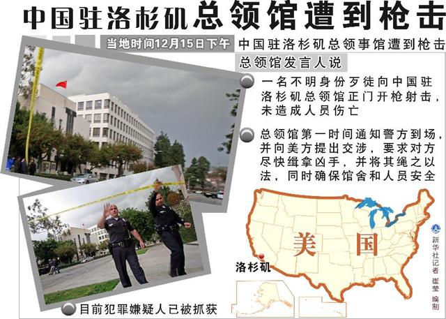 外交部发言人刘为民16日就枪击案答记者问时证实,目前犯罪嫌疑人已被抓获。中国驻美国使馆、驻洛杉矶总领馆已向美方提出交涉,要求加强对中国驻美机构和人员的安保工作。中方敦促美方尽快破案。