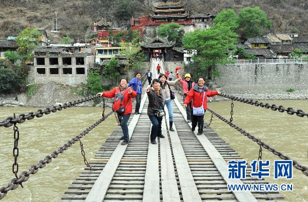 4月17日,一些游客在泸定桥上留影。今年是建党90周年,横跨四川省泸定县城大渡河两岸的泸定桥迎来了红色故地旅游热,每天慕名到此缅怀红军长征路上飞夺泸定桥革命历史的旅游者超过千人。建成于清代康熙45年(1706年)的泸定铁索桥全长103.67米,宽3米,为全国重点文物保护单位。新华社记者 陈海宁摄(资料图片)